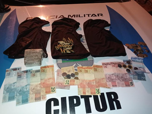 Com eles foram encontrados, uma bolsa que continha, 13 munições cal.38 intactas e 12 munições de 380 também intactas, um tablete de substância entorpecente análoga a maconha, um celular Motorola com carregador, 03 balaclavas (toca ninja), a quantia de R$414,90 (quatrocentos e catorze reais e noventa centavos), foi dado voz de prisão aos mesmos, sendo apreendido os itens e todos encaminhados à Central de Flagrantes para os procedimentos cabíveis.